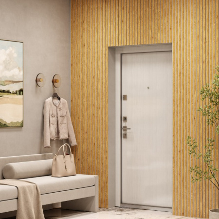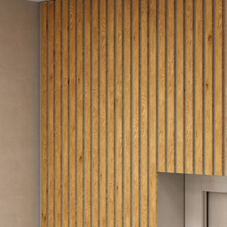 Декор панелей – рейки из черного мебельного МДФ, облицованные шпоном: устойчивы к деформации, привносят в интерьер умиротворение и гармонию, сохраняют связь с природой.