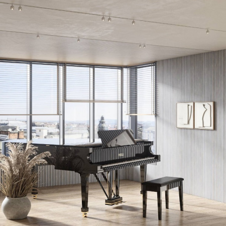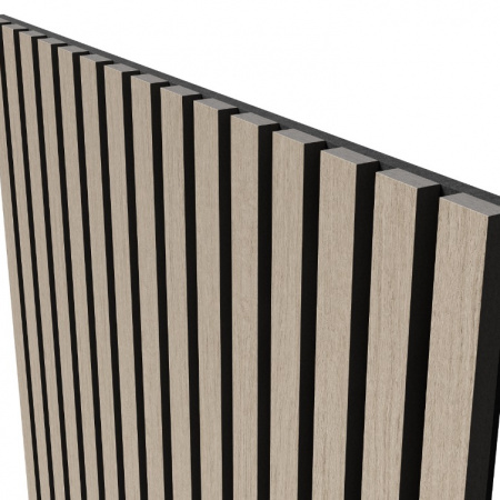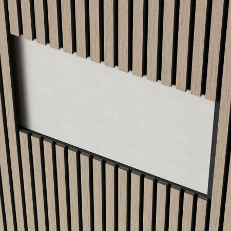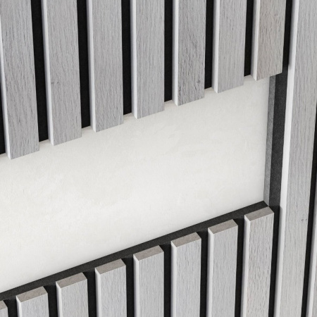 Изготовлен из экологичного волокна, устойчив к влаге, долговечен, воздухопроницаем, преломляет и подавляет звуковые волны. Декор панелей – рейки из мебельного МДФ, облицованные экошпоном: устойчивы к деформации, создают визуальный и тактильный эффект комфорта. Аналог деревянной рейки для стен в интерьере.