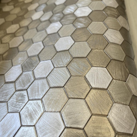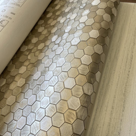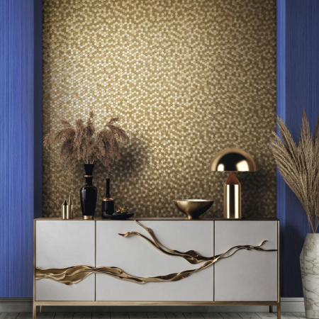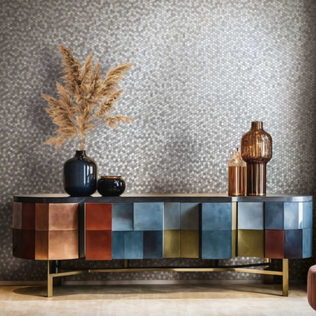 Мерцающие микрошестиугольники, играющие различными оттенками в зависимости от освещения, вдохновлены культовыми металлическими пластинами Paco Rabanne. Они придают пространству утонченный гламур и современный стиль.